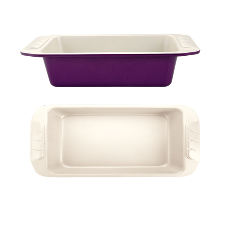 This beige and purple loaf tin is an excellent choice to gain the professional results in homemade baking. Durable heavy gauge 0,8mm carbon steel features even heating and resists warping. PTFE and PFOA free ceramic coating provides an exceptional non-stick performance – extra-smooth release and easy clearing. Extended handles are designed for secure grip even in oven mitts.