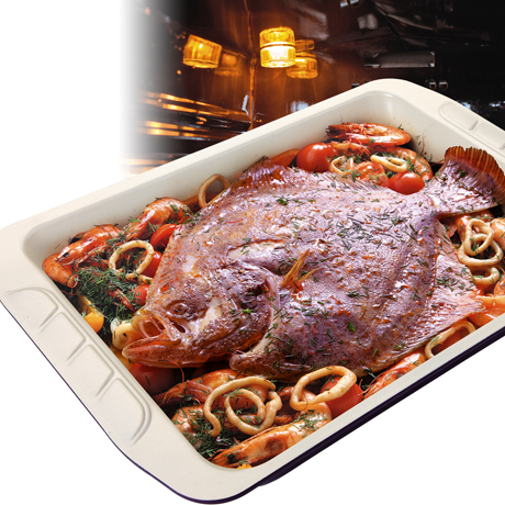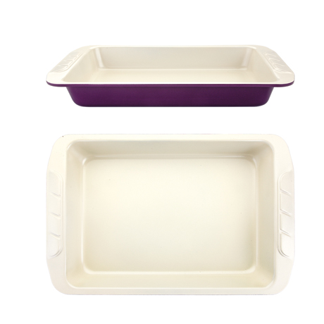 This beige and purple roast tray is an excellent choice to gain the professional results in homemade baking. Durable heavy gauge 0.8mm carbon steel features even heating and resists warping. PTFE and PFOA free ceramic coating provides an exceptional non-stick performance – extra-smooth release and easy clearing. Extended handles are designed for secure grip even in oven mitts.