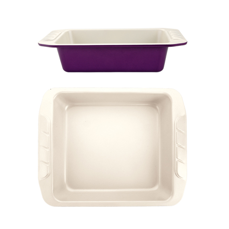 This beige and purple cake pan is an excellent choice to gain the professional results in homemade baking. Durable heavy gauge 0.8mm carbon steel features even heating and resists warping. PTFE and PFOA free ceramic coating provides an exceptional non-stick performance – extra-smooth release and easy clearing. Extended handles are designed for secure grip even in oven mitts.